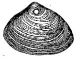 Fig. 7 is the skimmer clam, or surf clam; it is to be found on the entire length of the outside beach of Coney Island where the water is clear, and exposed to the constant action of the waves. There it constructs a burrow two or three feet deep. Sometimes, after an unusually low tide, it is left exposed one or two inches above the sand, when, if cautiously approached, it may be drawn out with a sudden jerk, but if alarmed, it will penetrate the sand quicker than it can be followed. Thousands of these clams are taken home by visitors to the island for the purpose of cooking, but when opened are found to be so full of fine sand that they are useless. It received the name of skimmer clam from the Dutch settlers, who used the empty shells for skimming their milk. On the beak, or highest point of the shell, is shown (in the drawing) a round hole made by the natica.