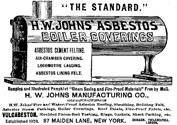 H. W. Johns' Fire and Water-Proof Asbestos Roofing, Sheathing, Building Felt, Asbestos Steam Packings, Boiler Coverings, Roof Paints, Fire-Proof Paints, etc. VULCABESTON. Moulded Piston-Rod Packing, Rings, Gaskets, Sheet Packing, etc.