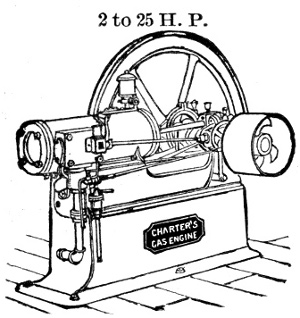 The furnace is a closed receiver, and is fed with coke. Air is pumped into it at a pressure of about 30 lb. to the square inch, part being delivered below the fuel and part above. That part which goes below rises through the incandescent coke, and appears at the surface as carbonic oxide. Here it meets the upper air supply and burns with a fierce bright flame, producing very hot gases, which are admitted to the cylinder and there expand, driving the piston before them. From experiments made by Mr. C. Ingrey with engines of this kind, it appears that they consume from 2¼ lb. to 2½ lb. of coke per brake horse power per hour, and thus provide power very economically.