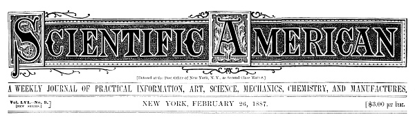 The Project Gutenberg EBook of Scientific American, Volume 56, No. 9, February 26, 1887, by Various This eBook is for the use of anyone anywhere in the United States and most other parts of the world at no cost and with almost no restrictions whatsoever. You may copy it, give it away or re-use it under the terms of the Project Gutenberg License included with this eBook or online at www.gutenberg.org. If you are not located in the United States, you'll have to check the laws of the country where you are located before using this ebook. Title: Scientific American, Volume 56, No. 9, February 26, 1887 Author: Various Release Date: February 18, 2015 [EBook #48300] Language: English Character set encoding: UTF-8 *** START OF THIS PROJECT GUTENBERG EBOOK SCIENTIFIC AMERICAN, FEB 26, 1887 *** Produced by Juliet, Wayne Hammond and other, Juliet Sutherland and the Online Distributed Proofreading Team at http://www.pgdp.net