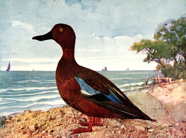 DAVIE says that the geographical distribution of this beautiful teal is western America, from the Columbia river south to Chili, Patagonia, and Falkland Islands; east in North America to the Rocky Mountains; casual in the Mississippi Valley, and accidental in Ohio. It is abundant in the United States west of the Rocky Mountains, breeding in Colorado, Utah, Nevada, California, Idaho, and Oregon. Its habits are similar to those of the blue-wing. Its favorite breeding-places are in fields of tall grass or clover, not far from water. The eggs range from nine to thirteen, and the nest is so completely woven of grass, feathers, and down that it is said the entire structure may be picked up without its coming apart. Oliver Davie, the well known ornithologist, says that it gave him pleasure to be able to add this beautiful duck to the avifauna of Ohio as an accidental visitor. On the 4th of April, 1895, a fine male of this species was taken at the Licking County reservoir by William Harlow. On the 6th Mr. Davie skinned and mounted it and it is now one of the rare Ohio birds in his collection. It proved to be good eating. This, he says, is the first record of the cinnamon teal ever having been taken in the state.