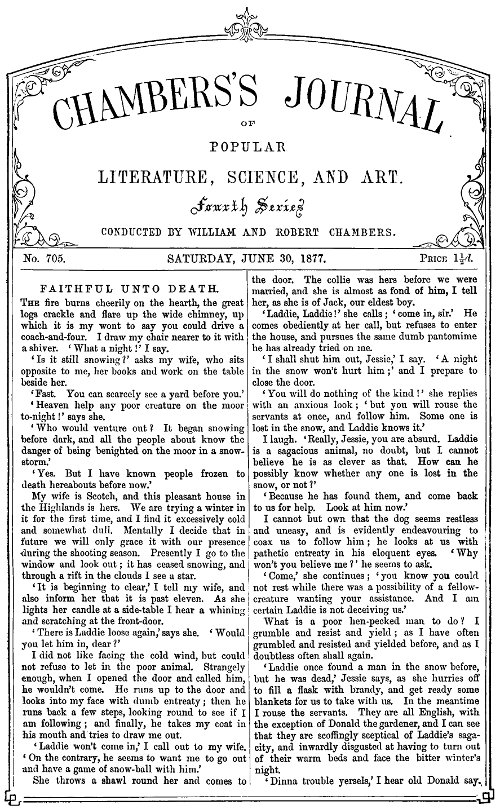 She lies in our little churchyard under a spreading yew-tree, and on the stone which marks her resting-place are inscribed the words, 'Faithful unto Death.' Our Laddie has gained far-spread renown for his good works; and as I sit finishing this short record of a tale of which he is the hero, he lies at my feet, our ever watchful, faithful companion and friend.