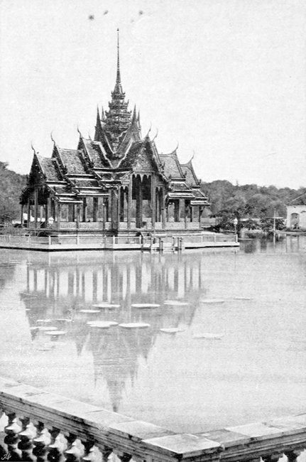 Durch mein mehr als energisches Auftreten hat Phya Smud den Ausflug nach Ayuthia, der früheren Hauptstadt des Reiches, nach vielem Zögern arrangirt; früh 6 Uhr wurden wir flott – ein sogenanntes »Houseboat« enthält alles Gepäck, die Vorräthe (für eine Woche genügend), den Weinkeller, Eis, dazu den chinesischen Koch und drei andere Celestials, sowie acht Matrosen, – die Barkasse führt uns vier, Phya Smud, den Heizer und Steuermann, – die kleinen Siamesen sehen in ihren weissen Uniformen recht possirlich aus. – Langsam dampfen wir stromauf, nach etwa einer Stunde verschwinden die letzten Häuser, darunter das grosse französische Missionsgebäude. – Niedriger Wald, hauptsächlich Jungle, vereinzelt eine Hütte, hie und da ein Rasthaus (Sala), ein offenes, auf vier Holzpfeilern ruhendes Häuschen mit Matten, die als Schlafstellen für Reisende dienen. Ein junges Krokodil taucht dicht neben uns auf, begleitet uns ein Stück, zieht sich aber bei dem beginnenden Schnellfeuer rasch zurück. Mehrere grosse mit Reis beladene Boote kommen entgegen; sie führen die Ernte aus Laos in die Bangkoker Schälfabriken. – Zahlreiche Adler umkreisen uns, am Ufer hocken schöne weisse Edelreiher, prächtige blaue Eisvögel, Strandläufer, zahlreiche Pfaue, merkwürdige Goldfasane in allen Farben des Regenbogens. Der Chef und ich schiessen von allen mehrere Exemplare, besonders pfeffern wir in einen ganzen Schwarm Wildenten (Teals), von denen 13 fallen, auf meinen ersten Schuss allein vier Stück. Gegen Mittag gerathen wir auf eine Sandbank und kommen nur nach angestrengter Arbeit wieder los. Dabei ist die Hitze hier unter dem einfachen Leinenzelte der Mouche, im vollen Sonnenbrande und in unmittelbarer Nähe der kleinen Dampfmaschine, ganz unerträglich. Sogar Neptun ist schlapp geworden und weigert sich ans Ufer zu gehen, um das geschossene Wild zu holen (seine Begleiterin, die gute Hündin Bompa, ist seit Singapore krank und hat ganz aufgehört zu fressen – sie ist unter Harrisons Pflege im Hôtel zurückgeblieben). – Nach neunstündiger Fahrt biegen wir rechts in einen schmalen Canal ein und halten in Bang-Pa-In, dem Sommerpalais des Königs. – Ein grosser Park mit zahlreichen ganz europäischen Baulichkeiten, sowie ein reizender hölzerner Pavillon im reinsten siamesischen Stile. – Zwei australische Strausse (Casuare) wandern im Garten umher. Ein Renaissancetempel mit dorischen Säulen wird für uns in Ordnung gebracht, in einem geräumigen Saale stehen vier Betten mit Netzen, in einem zweiten servirt der chinesische Koch ein exquisites Mahl, darunter die Wildenten! Wir sind mit dem Kaffee und Crême de Cacao beschäftigt, da tönt eine Glocke aus nächster Nähe – der »Angelus« im Innern Siams! Wir laufen hinaus und entdecken auf einer benachbarten Insel eine perfecte gothische Kirche, d. h. ein Wat im gothischen Stile. – Thurm, drei Schiffe, Kreuzfenster mit dem eingebrannten Bilde des Königs und der lateinischen Inschrift »Chulalonkorn, Rex Siamensis«, Hochaltar, auf dem ein goldener Buddha sitzt, – Seitenaltäre mit kleineren Buddhas, – Sacristei – und im Thurme die schöne Glocke, die, nach Sonnenuntergang geläutet, uns im Geiste nach Europa versetzt hatte.