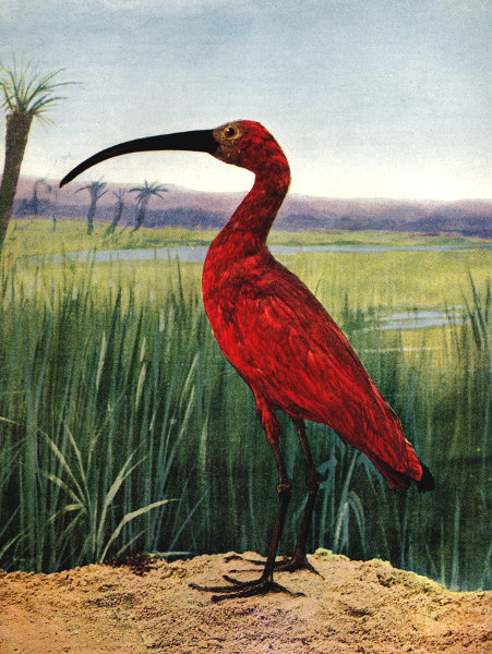 IBISES are distributed throughout the warmer parts of the globe and number, according to the best authorities, about thirty species, of which four occur in North America. The scarlet ibis is a South American species, though it has been recorded from Florida, Louisiana, and New Mexico. The ibises are silent birds, and live in flocks during the entire year. They feed along the shores of lakes, bays, and salt-water lagoons, and on mud flats, over which the tide rises and falls. Their food consists of crustaceans, frogs, and small fish.