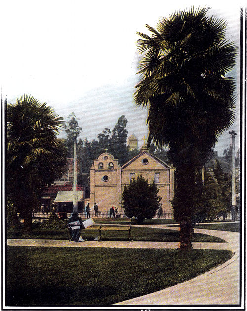 Keeping to the main road, northerly, from Monterey the traveler soon enters the great Santa Clara valley, passing not far from the well preserved Mission San Juan Bautista, established 1797. Through the valley, fertile and fruitful, parks of live oak and the seed farms—thousands of acres of sweet peas, of marketable bulbs, vegetable and floral—form the noticeable features. And these live oaks of California are marvelous. They are ever green like those of Palestine. Here are oaks that may have served as roofs to Indian council halls, with closely-lapping leaves that shed the rain and hide the sun, with branches that spread so wide and bow so low that they seem like great sheltering arms that both caress and protect. And then come the prune orchards, for this is the great prune producing valley of California. In Santa Clara county alone are planted more than five million prune trees. In the center of this orchard valley is San Jose, one of the oldest and most attractive cities of California. Here are excellent tourist resorts, the Hotel Vendome and the St. James, and up the mountains to the east one may see the white dome that shelters the great Lick telescope on Mount Hamilton. San Jose is a wide-awake 36 city, with smoothly paved streets, attractive parks, excellent schools and all advantages of a cultured up-to-date community, including electric railroads and libraries.