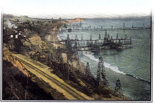 WHERE OIL AND WATER ALMOST MIX—DERRICKS AT SUMMERLAND WHERE OIL IS PUMPED FROM BENEATH THE OCEAN