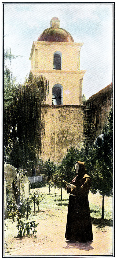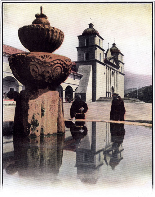 Away down in the southwest corner of this great nation of ours, behind mountain barriers, is the sun-kissed region that draws each year to it an army of tourists and seekers for that priceless joy that’s valued most when it’s lost health. It’s the great Land of Out-of-Doors here, with sunny skies and a climate that invigorates all the year around, all the way across the mesas and tablelands of the Painted desert region, across New Mexico and Arizona, across sandy wastes and cactus-spread plains into the Californian oasis country, where water and wisdom have helped make a paradise for all who believe that Nature is the best of doctors. It’s a sunshine orgy all the way. And Los Angeles, with its palms and olives, its crumbling adobes, side by side with thirteen-story fire-proof steel business blocks, electric railway cars whizzing everywhere—what a marvel of the Past, jostled by Progress! Here are hotels of all sorts and sizes, and homes that are marvels of luxury and elegance. Here you can study climatology and sociology, with variations; can view the simple life through the eyes of the man whose only home is a covered wagon; or, you can get a permit to enter the iron gateway of the park of some retired millionaire. Los Angeles, however, with all its charms, is only one small corner of Out-of-Door Land. The holy fathers of Mexico and old Spain found that out over a hundred years ago, when they started from Loreto, in Paja California, to make their mission pilgrimage up the Alta California coast. From San Diego and Los Angeles they headed northerly, establishing their mission stations a day’s journey apart. In sheltered valleys, on slopes that look far to seaward, by never-failing water courses, they planted the cross and marked out the boundaries of their holdings. No wide roadways could be thought of, but connecting these stations there soon was marked a broad trail—El Camino Real—the Highway of the King. Perhaps—who knows?—this name was given to do double honor—to the King of Kings, whose cross the padres bore, and to that monarch of Castile, whose bidding they were doing in aiding to carry his dominion into the newer world. Up the coast this old-time highway ran and to-day the steel highway of The Road of a Thousand Wonders follows it closely at many points, joining the missions of Los Angeles, San Gabriel, San Fernando, San Buenaventura, Santa Barbara, La Purisima, Santa Ynez, San Luis Obispo, San Miguel, San Antonio, Soledad, Carmel, San Juan, Santa Cruz, and others, just as musically named. The railway touches or runs close to all of these. At all these spots these wise men of the long ago found attractive sites, all under health-giving sun, and bathed by pure air, with a benign climate the year around. At Sonoma, a little north of San Francisco, the King’s Highway ended, but adventurous spirits pushed on northerly, up the headwaters of the Sacramento, and over the mountains into the Oregon wilderness, meeting before then trails of trappers and couriers du bois of the old Hudson’s Bay Company. And, over this trail of the trappers, runs the steel highway of to-day, bearing the traveler in comfort amid historic scenes. All of which—that well-worn Highway of the King, the missions, the trail of the trappers—sounds like romance with a liberal blend of realism. These twain are characteristic of all the big West—webs of romance and realism, lines of sentiment and science crossing and recrossing. It’s a garden land for poet or novelist.