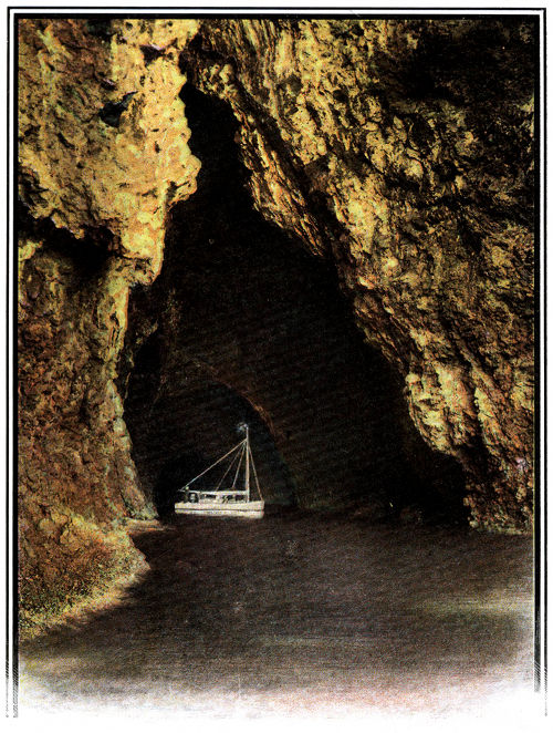 THE PAINTED CAVE ON SANTA CRUZ ISLAND RIVALS THE BLUE GROTTO OF CAPRI IN ITS COLORING OF ROCK AND WAVE-DEEP IN ITS VAULTED CHAMBERS SEALS AND SEA LIONS MAKE THEIR HOME