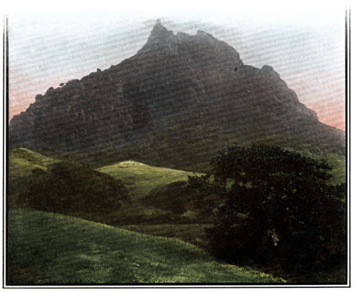 MITER MOUNT—ONE OF THE MANY WONDERS OF THE SANTA LUCIA MOUNTAINS WITH THEIR OAK-CLAD HILLSIDES AND INVITING CAÑONS WHERE EVERY CURVE SUGGESTS AN IDEAL HOMESITE FOR YOUR CASTLE IN SPAIN