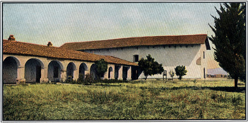 AT THE MISSION SAN JUAN BAUTISTA (1797)—THE BUILDING AND ITS ENVIRONMENT REFLECT MORE FAITHFULLY THE EARLY LIFE OF THE SPANISH PADRES THAN ANY IN THE STATE