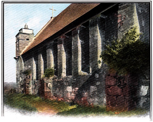 MISSION LA PURISMA CONCEPCION. IN THE BEAUTIFUL VALLEY OF LOMPOC—THE OLD RAFTERS, WITH THEIR RAWHIDE LASHINGS, STILL REMAIN AND KINDLY HANDS ARE PRESERVING AND RESTORING THE BUILDING