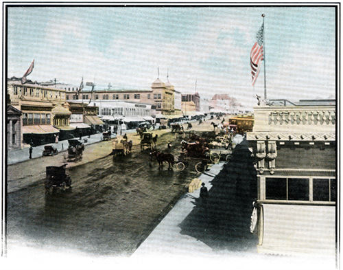 THE CITY OF SAN JOSE HAS MANY MILES OF SMOOTHLY PAVED STREETS AND ELECTRIC RAILWAYS—THIS IS ONE OF THE MAIN THOROUGHFARES WITH ST. JAMES’ PARK, A SHADY GARDEN SPOT, TO THE RIGHT