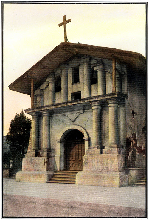 From far away the traveler approaching San Luis Obispo—the city whose mission was named by the Franciscans to honor the memory of their beloved bishop of Tolosa—sees a series of mountains that make him wonder if he is in the land of the Ptolemys. There are few more interesting or stranger formations than these pyramids that form the setting of San Luis Obispo; one that is peculiarly cleft, suggests a bishop’s miter, and this quaint freak of nature is said to have inspired the Padre Lasuen to give the city its name. The well laid out city is finely built, with many shade trees, well made roads, excellent water system, electric light and gas. In location it resembles Los Angeles, though it is nearer the ocean. The summer temperature has a maximum of ninety-four degrees; the winter minimum is thirty-two degrees. Lemon and orange trees thrive and roses bloom the year around. The many drives include a twelve-mile ride to El Pizmo, already described, a seven-mile trip to the famous San Luis Hot Springs with its sulphur plunge and baths located amid a beautiful sycamore grove, a nine-mile journey to Avila beach, near Port Harford, a fourteen-mile excursion to the famous Morro, with its singular rock towering above the ocean, and a seven-mile ride up Reservoir Cañon. In the heart of the town is the old mission, founded in 1772.