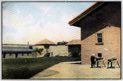 At Sacramento, the capital of California, one may spend a few days enjoying the soft air, the semi-tropical foliage, the orange and the olive and the palm, or perhaps getting a glimpse of Sutter’s Fort, notable in California history. It was to this point that John Marshall brought in January, 1848, the news, so soon to travel far and wide, of the discovery of gold in the millrace at Coloma. The fort is now a museum maintained by the orders of the Native Sons and Daughters of the Golden West. Here are stored reminiscences of the past; among them an old stage coach, riddled with bullets—placed there by ambitious highwaymen, and a prairie schooner with its old equipment reminds one of early overland history.