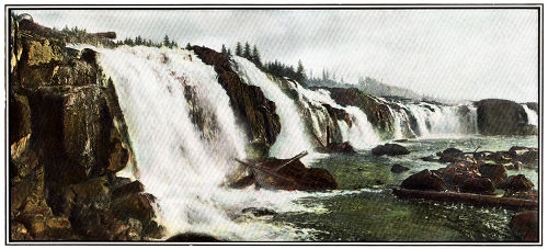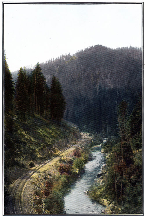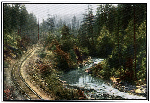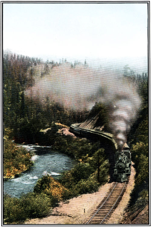 This Rogue river valley country, of which thriving Ashland and fast-growing Medford—cities of stone and brick—are the centers, sends broadcast, annually, thousands of boxes of the finest apples, pears and peaches. These rolling valleys and forest clearings make an unexcelled fruit and farming country. Jacksonville, off to the west, is on the old California trail; the first gold discovery of Oregon was near here, on Jackson creek. Over this trail, which the railroad closely follows, traveled adventurous trappers and hunters, and after that, the gold seekers, before the days of wagon-roads or railways. The road skirts the red waters of the Rogue—originally called Rouge by French-Canadian trappers of the Hudson’s Bay Company—as far as Grant’s Pass, a bustling city that is the center of a rich lumber, gold and copper mining and farming country. The Rogue and its tributaries, like other Oregon rivers, are fast flowing and 61 never failing streams, with rapids and waterfalls at frequent intervals, fringed by forest trees that help make pictures at every turn. Here, at Gold Ray, an enterprising electric power company has developed tremendous power, which will be used for the many mining industries, as well as in the progressive ranches and homes, through all this region.