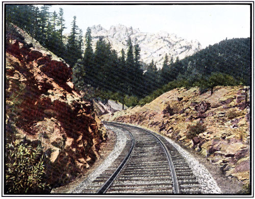 COW CREEK CAÑON NEAR WEST FORK—ALL DOWN THE RAVINE THE TORRENT RACES IN RAPID RIVALRY WITH THE TRAIN