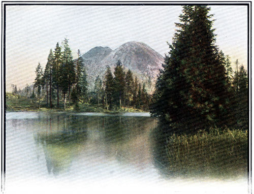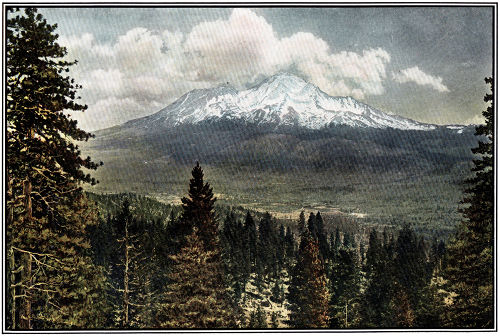FOR MILES THE TRAVELER KEEPS IN VIEW THE SNOWY SUMMIT OF SHASTA. EACH CHANGING PICTURE ATTRACTIVE, IMPRESSIVE AND ENDURING