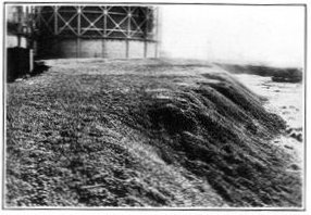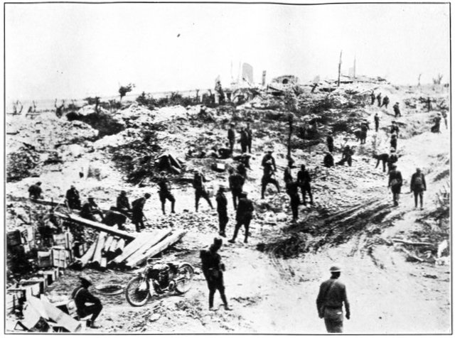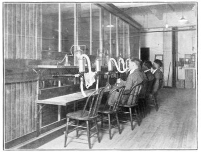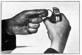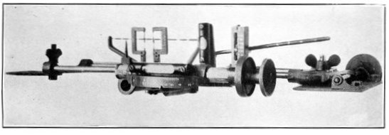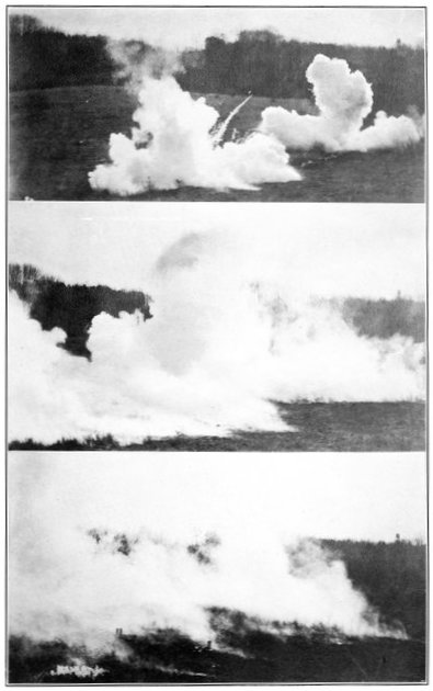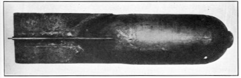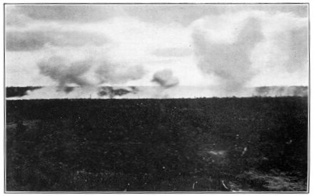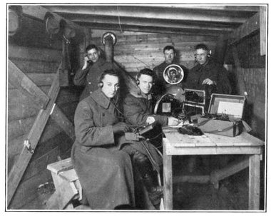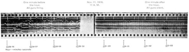 This is the last record by sound ranging of artillery activity on the American front near the River Moselle. It is the reproduction of a piece of recording tape as it issued from an American sound-ranging apparatus when the hour of 11 o'clock on the morning of November 11, 1918, brought the general order to cease firing, and the great war came to an end. Six seconds of sound recording are shown. The broken character of the records on the left indicates great artillery activity; the lack of irregularities on the right indicates almost complete cessation of firing, two breaks in the second line probably being due to the exuberance of a doughboy firing his pistol twice close to one of the recording microphones on the front in celebration of the dawn of peace. The two minutes on either side of the exact armistice hour have been cut from the strip to emphasize the contrast. Sound ranging was an important means of locating the positions and calibers of enemy guns. A description of these wonderful devices, which were a secret with America and the Allies, is given in Book III, chapter 4.