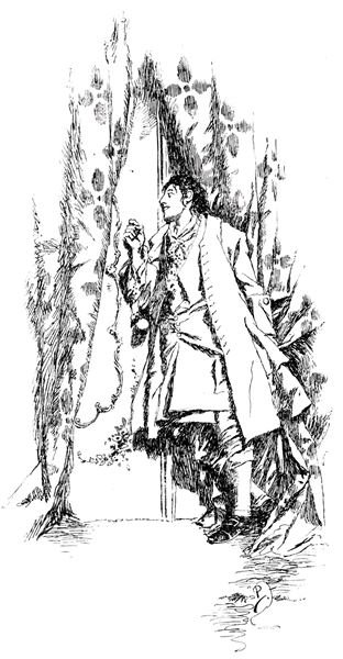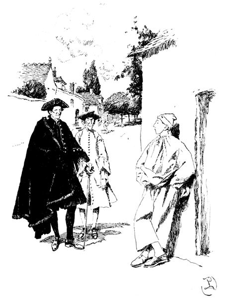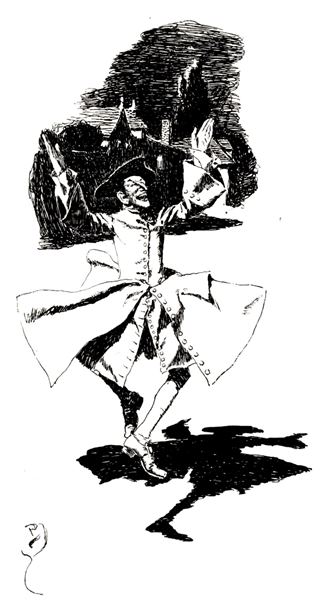 Flourens was a little town lying quite out of the usual route of young English travellers of rich connections making the "grand tour," and so, having nothing to recommend it in itself, was unknown to the great world without—dull, stupid, stagnant. Hardly ever a visitor from that great outside world appeared within the circle of its hopeless isolation. So it was a very strange thing to the town when one morning a great coach, as big as a house, dragged by four horses, with postilions clad in scarlet faced with blue, their legs incased in huge jack-boots, and each with a club queue as thick as his wrist hanging down his back, came whirling, rattling, lumbering, in the midst of a swirling cloud of dust, into the silence of the town. It was twice wonderful when the coach stopped at the inn, and it was thrice wonderful when an odd, lean, wizened little man, evidently the servant, let down the [Pg 8]steps and helped a strange gentleman from within. He was a tall, dark gentleman, dressed in black from head to foot—from the black hat with the black feather to the black silk stockings. From the gentleman's shoulder hung a long black cloak trimmed and lined with black fur, and Flourens had never seen his like before. He neither looked to the right nor to the left, but, without saying good or bad to any living soul, he and the odd, lean little servant entered the inn, leaving the crowd that stood without staring and gaping after him. Then the great coach disappeared through the arched gate that led to the stable-yard, but it was a long time before the crowd began to disperse, before the gossiping began to cease, before the cloud of silence and dullness and stagnation settled by degrees upon the town again. How it was maybe an hour and a half, and the last of those who had looked and wondered had gone about their business.