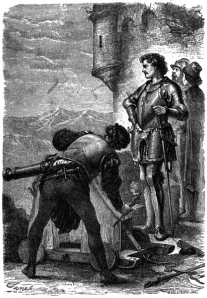 339. La tromba di fuoco fu un cannone di legno o di metallo lungo da 3 fino a 9 piedi empito di polvere e di altre materie accendibili, il quale innestavasi su la punta della picca onde scagliarlo contro i nemici. Il Biringoccio dice potersi adoperare e caricare a modo di artiglieria con palle di pietra ed altri proietti da cavarne miglior costrutto che non dal solo fuoco. Grassi, Diz. Militare.