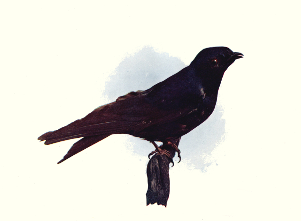 BEAUTIFUL and interesting as this bird is known to be, less has been said about it than of any of our common birds of agreeable song and manners. Its common names are house martin, purple swallow, American martin, and violet swallow. The young male is several years in attaining the uniform glossy violet-black plumage, the steel blue feathers appearing in gradually coalescing patches. It is common to the whole of temperate North America, wintering in Mexico and the Bermudas. It is only accidental in Europe. The adult female is glossy blue-black above, becoming hoary grayish on the forehead, and sometimes on the nape also. The young are similar to the adult female.