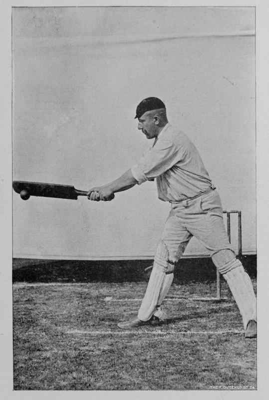 Every beginner aspires for the results of batting which are recorded by the scorer, conveniently ignoring the hard work of those who by many patient efforts have reached comparative perfection. But the repeated loss of his wicket will force him to reason out why a straight bat thwarts the bowler’s efforts, and why when playing a “cross bat” he has been unconciously reducing his defense in a ratio of four to one. To help this reasoning process let us demonstrate by stating that the batsman’s wicket without the bails presents to the bowler a surface of 216 square inches. The batsman who wields a straight bat covers about 120 square inches of the wicket, hands and gloves increasing it to about 130 inches. The “cross bat” presents a defense of only 34 square inches, or one-fourth that of a “straight bat,” the hands and gloves ceasing to the part of the defense for a “cross bat.” When the legs and pads of the batter are added to the defense, the bowler would seem to have an almost impossible task to “out” the wielder of the “straight bat.” Yet the “man out” seldom understands it, for he has not profited by the tremendous mathematical advantage of a “straight bat” over a “cross bat.” When this difference is appreciated and acted upon, the lesson of “blocking” has been learned and the batsman may expect scores: for he is ready to hit intelligently.