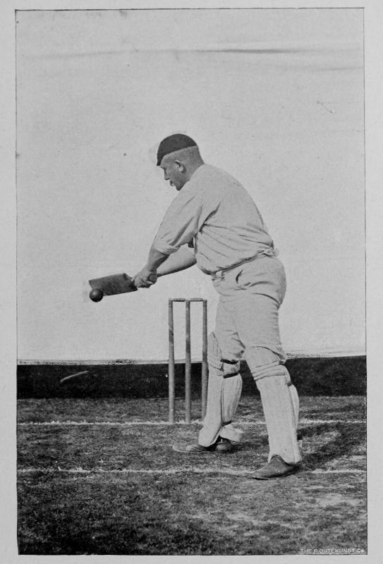 Each ball is a lesson to the eye of the batsman who has learned to play a “straight bat.” The forward block as shown in illustration, must obtain for well pitched balls rising to the bails. The bat must be forwarded to the ball with left shoulder well over it, the bat carried at an angle of about 70°, the eye of the batsman being intently fixed upon it in order to insure against personal accidents. Such action, if prompt, forces the ball forwards towards the bowler. If the ball is met by the bat it strikes the ground at the angle of least resistance, bounds quickly into the field, and a run may result. Having given at length the necessity for the “block” as well as the scientific reasons for the play, we will refer the reader to illustrations Nos. 3, 4, 5 and 6, which show the “forward block,” the “half forward block,” the “half back block” and the “late block.” If the young cricketer will study the attitudes taken by Mr. George Bromhead when making the four characteristic blocks, he will see that each ball must be blocked in a manner appropriate to itself.