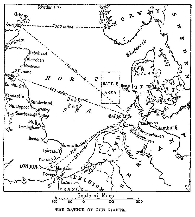 “My dear Copplestone,—Picture to yourself our feelings. On Wednesday we were in the fiery hell of the greatest naval action ever fought. A real Battle of the Giants. Beatty’s and Hood’s battle cruisers—chaffingly known as the Salt of the Earth—and Evan Thomas’s squadron of four fast Queen Elizabeths had fought for two hours the whole German High Seas Fleet. Beatty, in spite of his heavy losses, had outmanœuvred Fritz’s battle cruisers and enveloped the German line. The Fifth Battle Squadron had stalled off the German Main Fleet, and led them into the net of Jellicoe, who, coming up, deployed between Evan Thomas and Beatty, though he could not see either, crossed the T of the Germans in the beautifullest of beautiful manœuvres, and had them for a moment as good as sunk. But the Lord giveth and the Lord taketh away; it is sometimes difficult to say Blessed be the Name of the Lord. For just when we most needed full visibility the mist came down thick, the light failed, and we were robbed of the fruits of victory when they were almost in our hands. It was hard, hard, bitterly hard. But we had done the utmost which the Fates permitted. The enemy, after being harried all night by destroyers, had got away home in torn rags, and we were left in supreme command of the North Sea, a command more complete and unchallengeable than at any moment since the war began. For Fritz had put out his full strength, all his unknown cards were on the table, we knew his strength and his weakness, and that he could not stand for a moment against our concentrated power. All this we had done, and rejoiced mightily. In the morning we picked up from Poldhu the German wireless claiming the battle as a glorious victory—at which we laughed loudly. But there was no laughter when in the afternoon Poldhu sent out an official message from our own Admiralty which, from its clumsy wording and apologetic tone, seemed actually to suggest that we had had the devil of a hiding. Then when we arrived at our bases came the newspapers with their talk of immense losses, and of bungling, and of the Grand Fleet’s failure! Oh, it was a monstrous shame! The country which depends utterly upon us for life and honour, and had trusted us utterly, had been struck to the heart. We had come back glowing, exalted by the battle, full of admiration for the skill of our leaders and for the serene intrepidity of our men. We had seen our ships go down and pay the price of sea command—pay it willingly and ungrudgingly as the Navy always pays. Nothing that the enemy had done or could do was able to hurt us, but we had been mortally wounded in the house of our friends. It will take days, weeks, perhaps months, for England and the world to be made to understand and to do us justice. Do what you can, old man. Don’t delay a minute. Get busy. You know the Navy, and love it with your whole soul. Collect notes and diagrams from the scores of friends whom you have in the Service; they will talk to you and tell you everything. I can do little myself. A Naval Volunteer who fought through the action in a turret, looking after a pair of big guns, could not himself see anything outside his thick steel walls. Go ahead at once, do knots, and the fighting Navy will remember you in its prayers.”