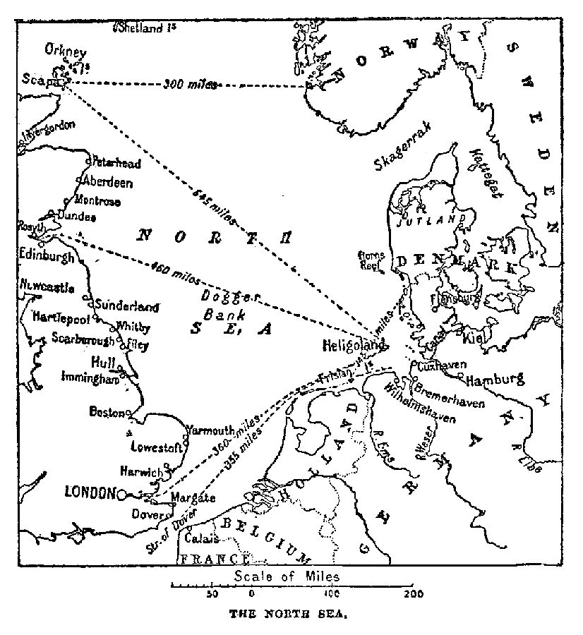 “Could not Jellicoe,” I asked, “have worked right round so as to draw a line across the mouths of the Elbe and Weser, and to cut Scheer completely off from the approaches to Wilhelmshaven?”