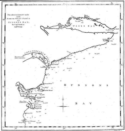 Or whether Gibbons went through Hudson's Bay is equally uncertain. The undiscovered Parts of which Bay, or the Openings that were not determined in the Expedition in the Year 1747, are in a Map hereto annexed. But the Termination of Chesterfield's or Bowden's Inlet hath been since searched by the Direction of the Hudson's Bay Company, and a Plan made of it, which I have not seen. Their Design was to go as far up such Inlet until it terminated, or there was a Passage into another Water. But as it is terminated by Land, and if there is no Inlet or Opening left on the North or South Shore unsearched, or a Survey taken from the Heights, by which they could be satisfied there was no Communication with any other Waters by which there could be a Passage, it is to be concluded that Chesterfield Inlet is no Streight or Passage as was expected, and it appeared to be as far as the Californias Boat went up, according to the Report made at that Time. The People who had been in the Boat belonging to the California, when the Ship was going up Wager Bay, where, from the Depth of the Water, the Breadth between both Shores, the high mountainous Land, there was great Reason to believe there was a Streight or Passage: Those People declared, if there was a Streight they were assured that Chesterfield Inlet was a Streight also.
