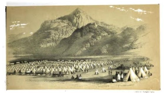 A brilliant moon rose early, and we sat round a cheerful camp-fire, smoking our first pipe in what might be called the bush; the long lines of tents and white-topped waggons peeped from among the dark trees, bright fires encircled by red coats shone everywhere; the oxen tied to the yokes lay grouped together, the horses stood sleeping, the Hottentots scraped their fiddles and screeched under their waggons, and in the distance the sentinels paced up and down their beat; while above the general hum, rose every now and then the loud laugh and merry song, finishing occasionally with the mournful howl of a jackal.