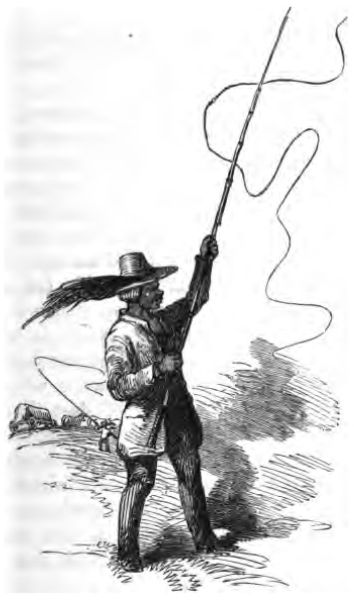On the fourth day after landing, tents were struck at eight in the morning, and we marched through the long straggling street of Port Elizabeth, accompanied for some distance out of the town by a motley crowd, screaming and dancing round the band. A long train of about thirty lumbering waggons, each drawn by ten or fourteen of the largest bullocks we had ever seen; carrying immense and most inconvenient-looking horns, brought up the rear. Naked little "voorloupiers"[1] led the teams, which were driven by dwarf Hottentots flourishing enormous bamboo whips eighteen or twenty feet in length, the incessant cracking of which was like the report of so many pistols, as they descended with volleys of Dutch oaths on the backs of the unfortunate oxen answering to the names of Schwartlande, Bluberg, or Scotlande.