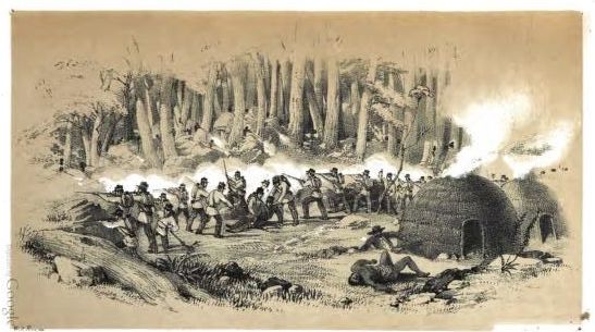 Simultaneously with these attacks they consummated their cowardly treachery by a general and concerted massacre at all the military villages, under circumstances of the most atrocious and cold-blooded ferocity. These military settlers were discharged soldiers, who had grants of land assigned to them, with assistance from government on a liberal scale to start them in their farms, the condition of tenure being, that they should be ready at[14] any time to turn out for the defence of the country, receiving good pay and allowances while on service. A number of prosperous little villages thus sprang up, and the settlers lived on the most friendly terms with the neighbouring Kaffirs, constantly entertaining them as their guests, and employing many on their farms. Of their hospitality the Kaffirs treacherously availed themselves to the full, to allay suspicion and prepare the way for the intended massacre. Hurried orders to prepare themselves for the worst had but just arrived in consequence of the attack at Keiskamma Hoek, on the previous day, when the Kaffirs rose at a signal, and massacred the inhabitants, whose guests many of them had just been sharing their Christmas dinner. The women were stripped, and escaped with difficulty, and the houses were burned to the ground. Johannesberg, Woburn, and Auckland, among others, were thus entirely destroyed, every man at the latter being killed.