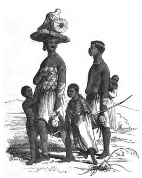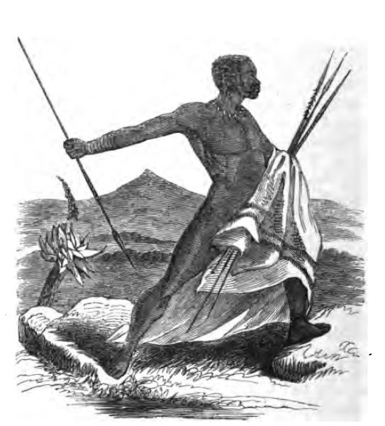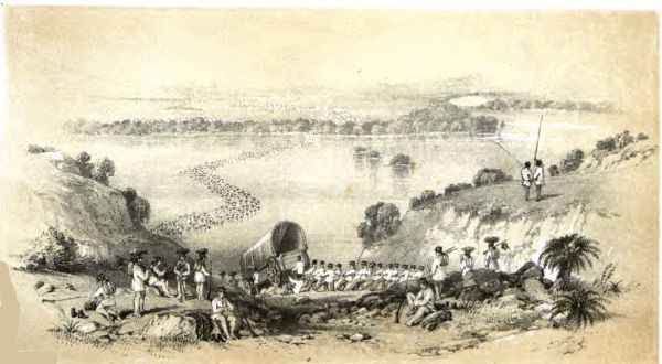 Here the troops were transferred to large boats, from which again, one by one, we were all carried ashore, through a tremendous surf, sitting astride on the shoulders of naked Fingoes; tall, athletic fellows, adorned with armlets and necklaces of brass and beads, and wearing pendant in front, a most grotesque and sometimes elaborate ornament, which as much astonished our men, as it excited their merriment. Our landing on the 16th of the month was an odd coincidence, as we had sailed from Cork on the 16th of March, and crossed the line on the 16th of April.