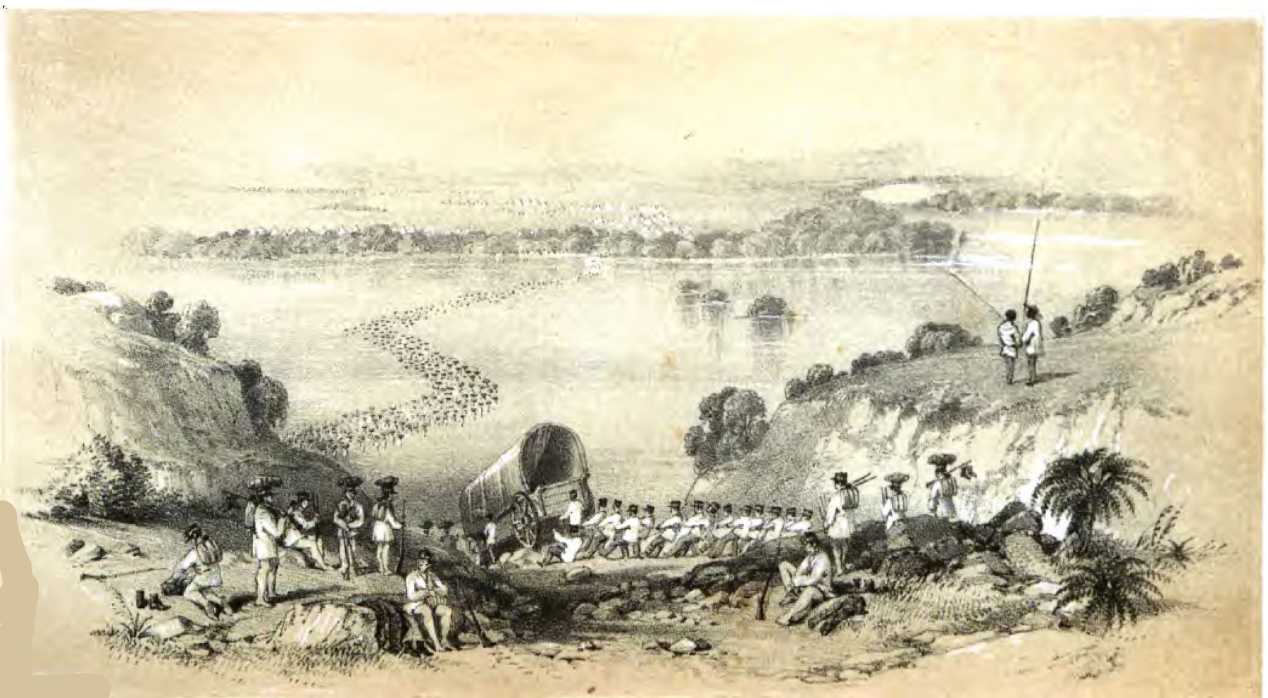 On the 19th a great meeting of all the Gaika tribes and chiefs was held at Fort Cox, when above 3000 assembled, and were addressed by the Governor on the conduct of Sandilli, who, with his half-brother Anta, was outlawed, and large rewards offered for their apprehension. His Excellency impressed on them his determination to preserve order, and, if needful, to enforce it by the troops; but they had, no doubt, already fully resolved on war, and must have felt pretty confident in the strength of their position and forces, for on his threatening them that, in case of necessity, he could bring ships full of troops to the Buffalo mouth, he was significantly asked, "If he had any ships that could sail up the Amatolas?"