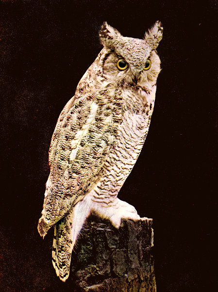 The Western Horned Owl of our illustration is a variety of the Great Horned Owl (Bubo virginianus) of eastern North America. It has a wide and extensive range reaching from Manitoba, on the north, into the table-lands of Mexico on the south and eastward from the Pacific coast across the Great Plains. Occasionally specimens are taken as far east as the states of Illinois and Wisconsin. It is replaced in the Arctic regions by the Arctic Horned Owl (Bubo virginianus arcticus), which is lighter in color, its range only reaching as far south as Idaho and South Dakota. The Western Horned Owl breeds nearly throughout its range. It is of interest that this Owl is not an inhabitant of high altitudes but rather of the foothills and more open country of its range. The Dusky Horned Owl (Bubo virginianus saturatus), the darkest colored of all the owls, taking its place in the higher regions.