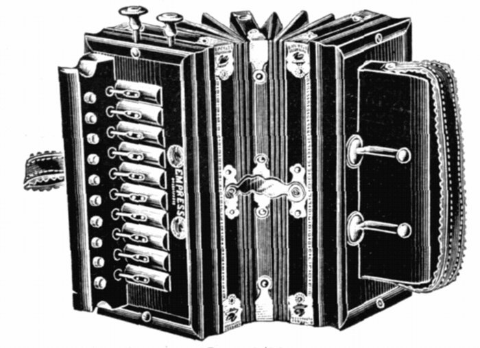 | 58. | Nickel shell, wood lined, wire edge, birch neck, ebony pegs, grooved hoop, metal tail-piece; 13 hexagon brackets, all parts finely nickel plated | 12 00 |