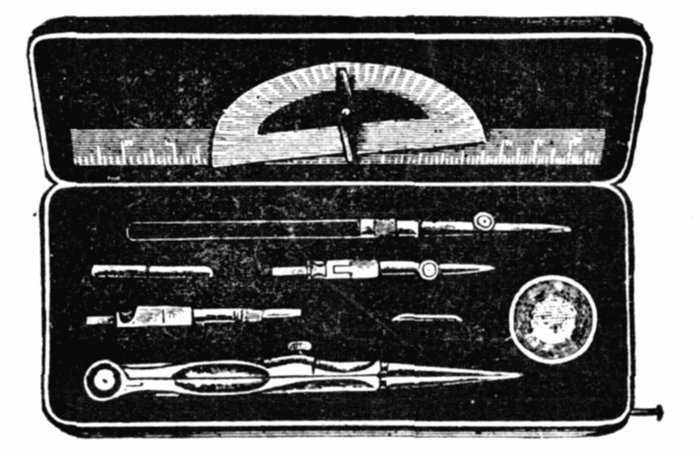 | 14/708. | Similar to cut. Eight piece set, containing, divider, pen and pencil points, box of leads, tightening key, protractor, wood rule and saucer. Size of case, 6 × 2½ inches | $6 50 |