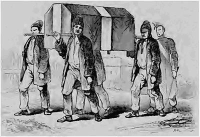 Les corps des forçats qui meurent à l'hôpital du bagne sont transportés à l'hôpital principal de la marine et déposés à l'amphithéâtre pour y servir aux études anatomiques des étudiants en chirurgie. Cette translation se fait sans cérémonie religieuse. Les forçats qui portent le cercueil ne sont pas accouplés, ils ont seulement un anneau de fer à une jambe. Un garde-chiourme les accompagne.