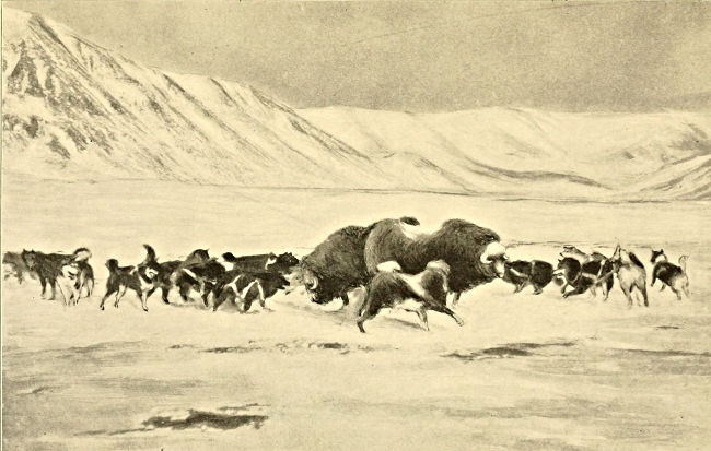 Every one now busied himself turning loose his dogs,—a small matter for the Indians, with their [Pg 21]simply sewn harness from which the dogs were easily slipped, but a rather complex job for me. My dog train had come from the Post, and its harness was made of buckles and straps and things not easily undone in freezing weather; so it happened that by the time my dogs were unhitched, the Indians and all their dogs were fully quarter of a mile nearer the musk-oxen than I and running for very dear life. My preconceived notions of the musk-ox hunting game were in a jiffy jolted to the point of destruction, as I now found myself in a situation neither expected nor joyful. It was natural to suppose some assistance would be given me in this strange environment, and that the consideration of a party of my own organizing and my own paying should be my killing the musk-ox for which I had come so long a distance. But we were a long way from the Post and interpreters and restraining influences; and at this moment of readjustment I speedily realized that it was to be a survival of the fittest on this expedition, and if I got a musk-ox it would be of my own getting. It comforted me to know that, even though somewhat tucked up as to stomach, due to three days’ hard travel on only tea, I was in fine physical[Pg 22] condition, and up to making the effort of my life.