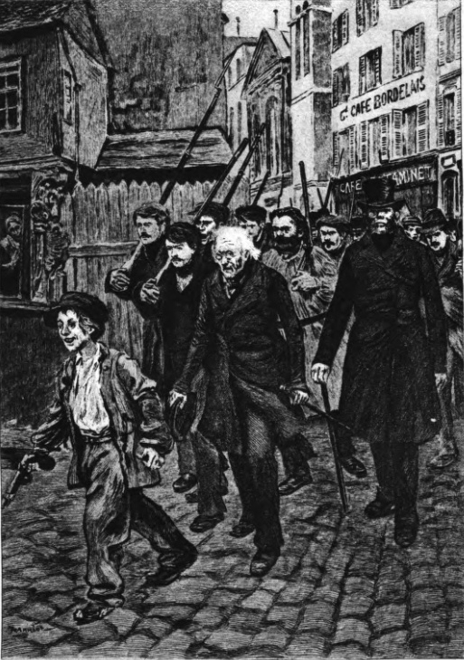 It is the masterpiece of powerful minds to save themselves by what has ruined them; and Gavroche measured the whole situation at a glance. It was the truck that had compromised him, and so the truck must now protect him. At the moment when the sergeant was going to rush on Gavroche, the truck, converted into a projectile and launched at full speed, rolled upon him furiously, and the sergeant, struck in the stomach, fell back into the gutter, while his musket was discharged in the air. On hearing their sergeant's cry, the guard hurried forth pell-mell; the shot produced a general discharge blindly, after which the guns were reloaded, and they began again. This blindman's buff firing lasted a good quarter of an hour, and killed sundry panes of glass. In the mean while, Gavroche, who had turned back, stopped five or six streets off, and sat down panting on the bench at the corner of the Enfants Rouges, and listened. After breathing for a few minutes, he turned in the direction where the musketry was raging, raised his left hand to the level of his nose, and thrust it out thrice, while striking the back of his head with his right hand,—a sovereign gesture, in which the Parisian gamins have condensed French irony, and which is evidently effective, as it has already lasted more than half a century. This gayety was troubled by a bitter reflection.