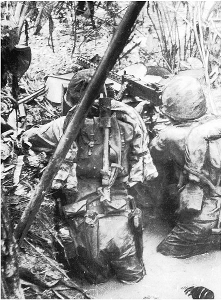 Raiders, up to their hips in water, man a machine gun along a jungle trail. Department of Defense Photo (USMC) 70764