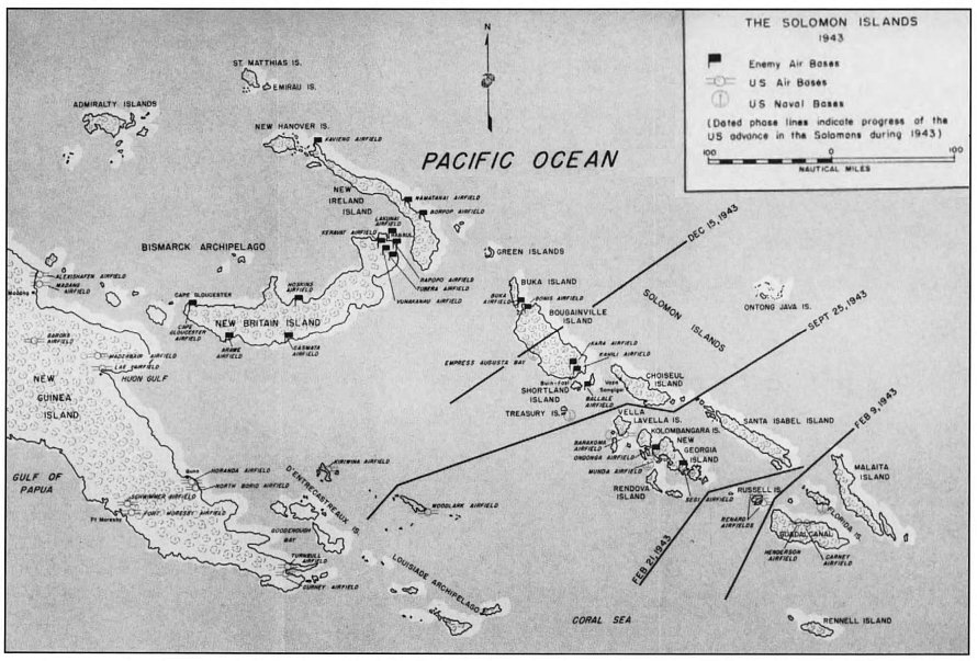 This kind of strong enemy reaction, in the air and at sea, had been expected by American staff officers who had put in long weeks planning the Bougainville operation. Looking at a map of the Solomon Islands chain, it was obvious that this largest island (130 by 30 miles) on the northwest end was a prime objective to cap the long and painful progress northward from the springboard of Guadalcanal at the south end. As Guadalcanal had been the beginning of the island chain, so now Bougainville would mark the top of the ladder in the Northern Solomons. From Bougainville airfields, American planes could neutralize the crucial Japanese base of Rabaul less than 250 miles away on New Britain. From Bougainville, the enemy could defend his massive air-naval complex at Rabaul. “Viewed from either camp, the island was a priority possession.”