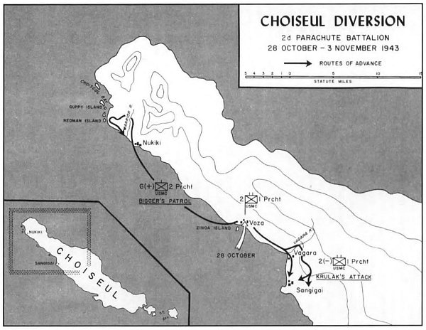 It was a most unusual raid, 656 men, a handful of native guides, and an Australian coastwatcher with a road map. The Navy took Krulak’s reinforced battalion of parachutists to a beach site near a hamlet called Voza. That would be the CP (command post) location for the duration. The troops slipped ashore on 28 October at 0021 and soon had all their gear concealed in the bush.