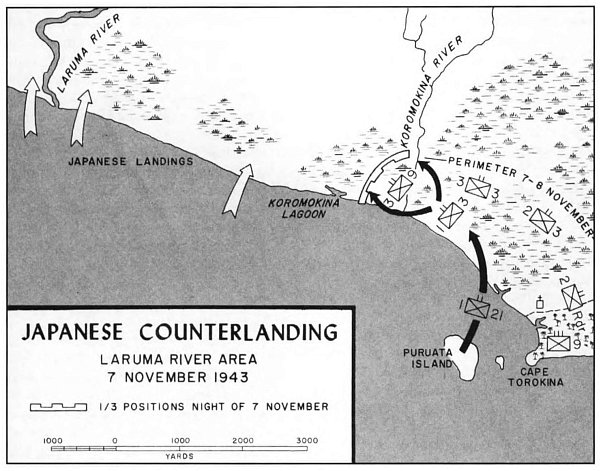 Then, at dawn on the morning of 7 November (D plus 6), the Japanese struck. Four of their destroyers put ashore 475 men well west of the Marine perimeter, between the Laruma River and the Koromokina Lagoon. They landed in 21 craft: barges, ramped landing boats, even a motor boat, but, to their disadvantage, along too wide a front for coordinating and organizing a strike in unison and immediately. A Marine Corps combat correspondent, Sergeant Cyril J. O’Brien, saw the skinny young Japanese who scampered up the beach with 80-pound packs two-and-a-half miles from the Laruma to near the Koromokina, left flank of the Marines, to join their comrades.