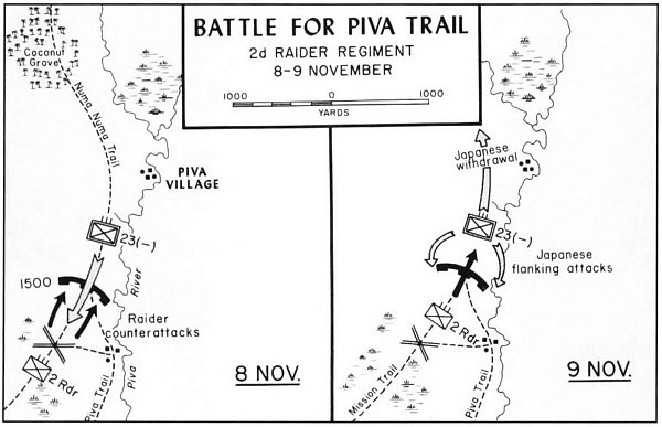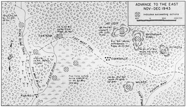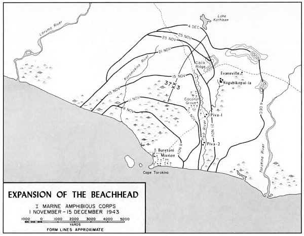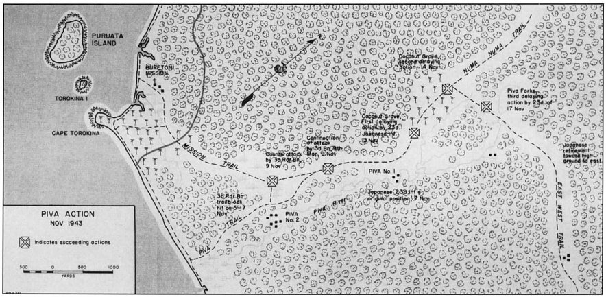 Meanwhile, on Puruata Island, just offshore of the landing beaches, the noise was intense; a well-dug-in contingent of Japanese offered stiff resistance to a reinforced company of the 3d Battalion, 2d Raiders. It was midafternoon of D plus one before the defenders in pill boxes, rifle pits, and trees were subdued, and then some of them got away to fight another day. A two-pronged sweep and mop-up by the raiders on D plus 2 found 29 enemy dead of the 70 Japanese estimated to have been on that little island. The raiders lost five killed and 32 wounded.