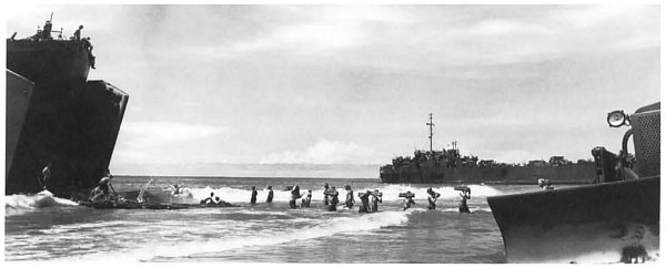 As seen from a beached landing craft, these Marines are under fire while wading in the last few yards to the beach.