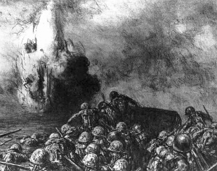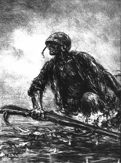 Artist Kerr Eby, who landed at Tarawa as a participant, entitled this sketch “Bullets and Barbed Wire.”
