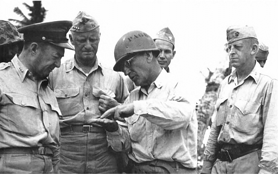 MajGen Julian C. Smith, wearing helmet liner at center, describes the nature of the recently completed conquest of Betio to Adm Chester Nimitz, facing camera, and Army LtGen Robert Richardson during their visit to the island on 27 November 1943. An exhausted Col Edson looks on at right. While they talked, the smell of death pervaded over the island.