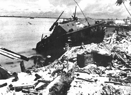 Amtrack Number 4-8 is jammed against the seawall barricade. Three waterlogged Marines lie beneath it. Four others are scattered nearby, and there is one hanging on a two-foot-high strand of barbed wire who does not touch the coral flat at all. Back of the 77mm gun are many hundreds of rounds of 77mm ammunition.